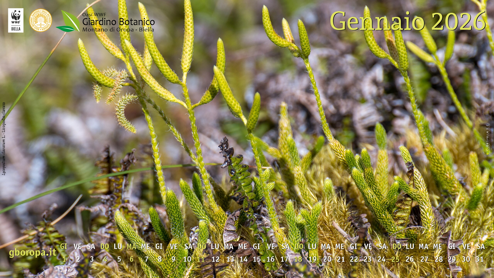 Gennaio: Lycopodium clavatum L. In Italia si trova nei pascoli subalpini, brughiere, spesso associato con mirtillo e brugo, boschi radi di conifere e faggete, pendii pietrosi, su substrato asciutto o fresco, marcatamente acido, da 200 a 2300 m s.l.m., nel biellese è raro.